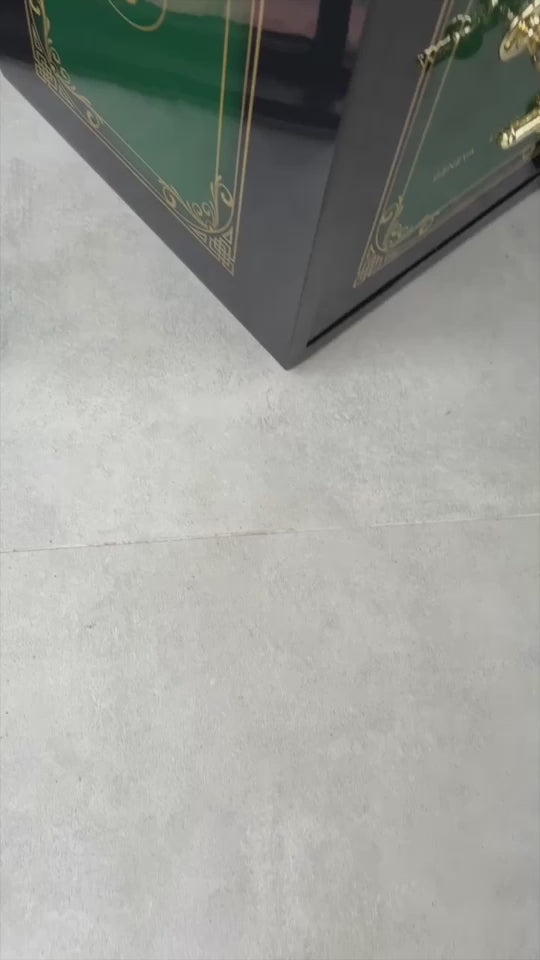 This safe was chosen from my stock and the customer wanted a classic black green design, so we put various designs together and they chose this one. What a lovely looking solid safe, the inside brass is a nice as the outside. This is a very well made safe, and now with a new lease of life.